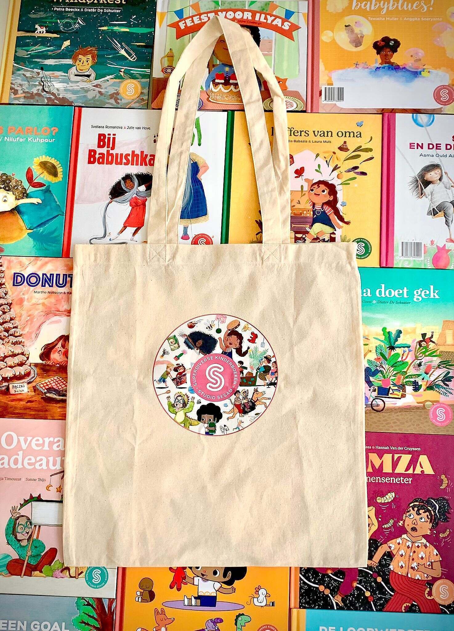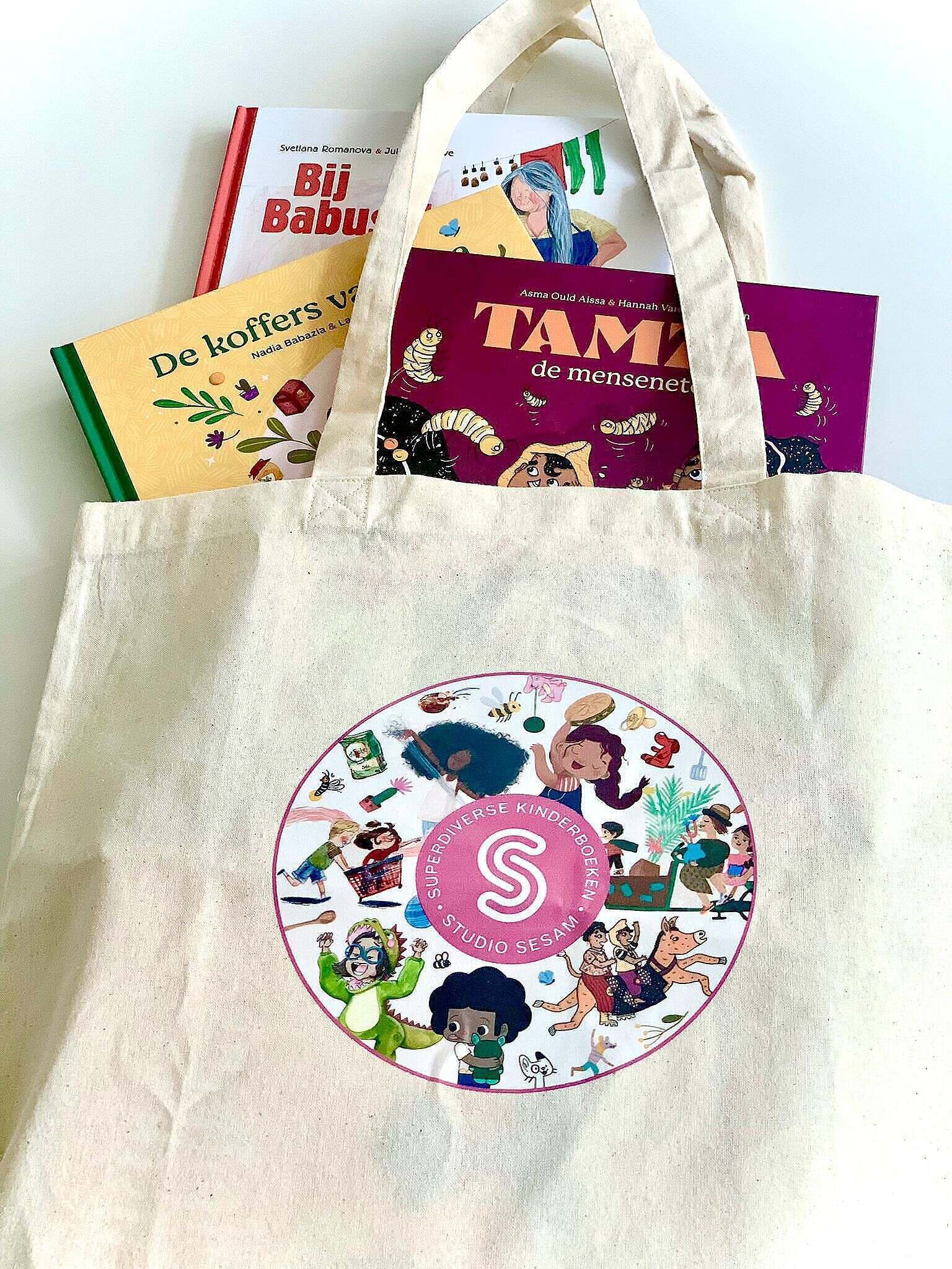 Een leuk linnen draagtasje met de hoofdpersonages Ali, Yasmina, Mouna, Sasha, Amin, Aga & Kamil en Amar & Silya uit de nieuwe Sesam-prentenboeken.